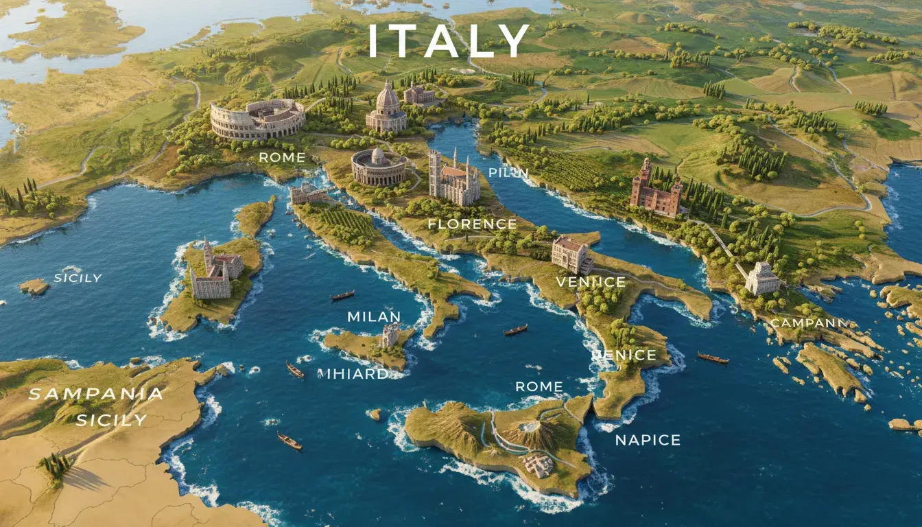 O mapa italia destaca cidades históricas como Roma, Florença, Veneza e Nápoles, além de regiões naturais e culturais como a Costa Amalfitana, Cinque Terre, Dolomitas, Lago de Como, Etna, Vale dos Templos, entre outros.